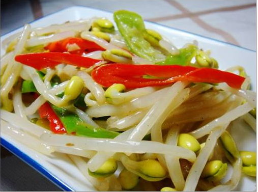 做法: 1、青紅尖椒洗淨切絲,黃豆芽摘去根尖部洗淨,用滾水焯15秒馬上撈起過涼水備用。 2、起鍋熱油,爆香薑末,放入青、紅椒絲和黃豆芽一起快速翻炒,用鹽、蘑菇精調味後即可出鍋